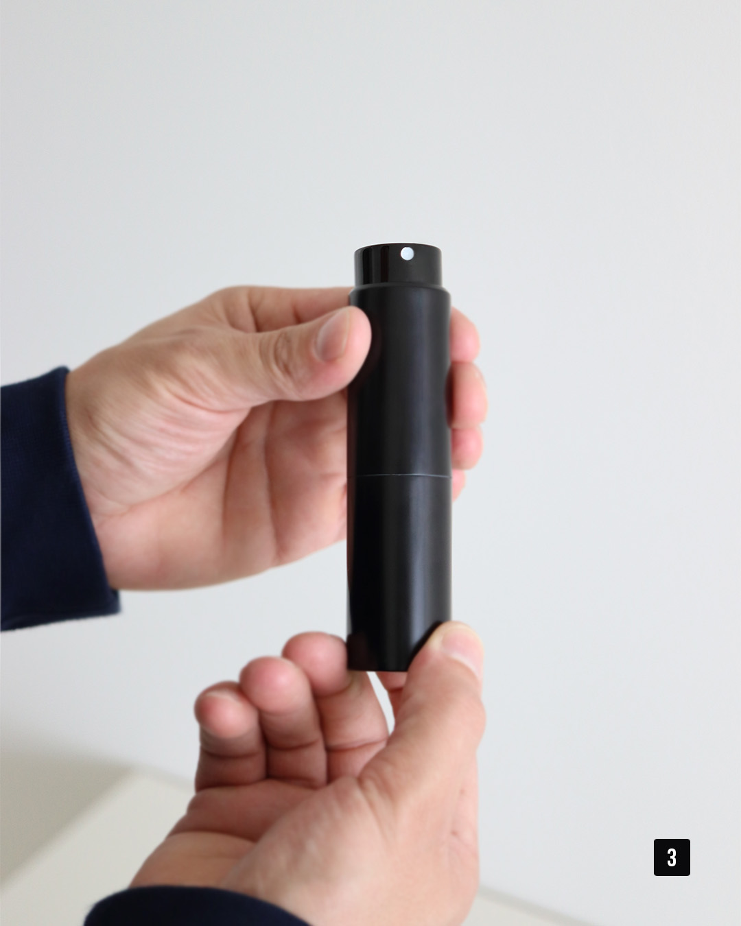 1. Installez la recharge sur la tête de pulvérisation du Parfum Case (Réf. 106).